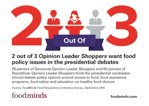 Chicago, Ill. (October 5, 2016) – At a time when Democrats and Republicans agree on few solutions to the challenges facing America, FoodMinds’ fourth “Food Temperance in America” survey found two out of three Opinion Leader Shoppers – registered voters that express their food values in the grocery store, in public forums and in their politics – support including food policy issues in the presidential debates, with 76 percent of Democrat Opinion Leader Shoppers and 50 percent of Republican Opinion Leader Shoppers thinking the presidential candidates should debate policy options around access to food, food assistance programs, food safety and education on healthy food choices.There was an uptick among Republican Opinion Leader Shoppers calling for the inclusion of food issues in the debates, with only 42 percent of this group favoring food policy deliberation in 2012, the last time FoodMinds conducted the survey.